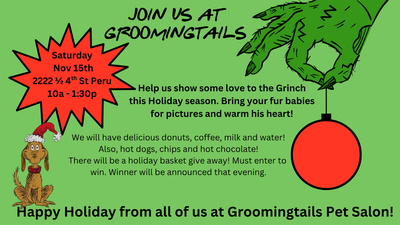 Help us show some love to the Grinch this Holiday season. Bring your fur babies for pictures and warm his heart! There will be delicious donuts, coffee, milk and water! Also, hot dog, chips and hot chocolate! We will also have a holiday basket give away that guests can register to win.